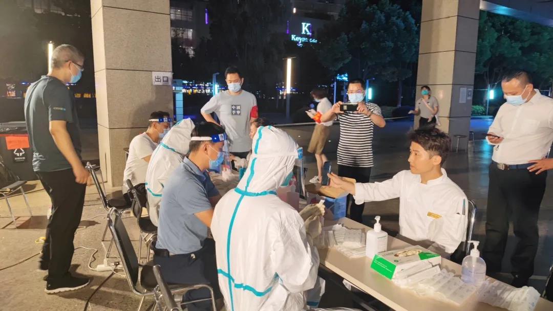 7月22日,九三学社南京市建邺区基层委员会社员、江苏省第二中医院急诊科副主任何小卫,带队在建邺区西格玛广场参加核酸取样,在社区干部和志愿者协助下,4名队员4.5个小时采样804份。(章泳)