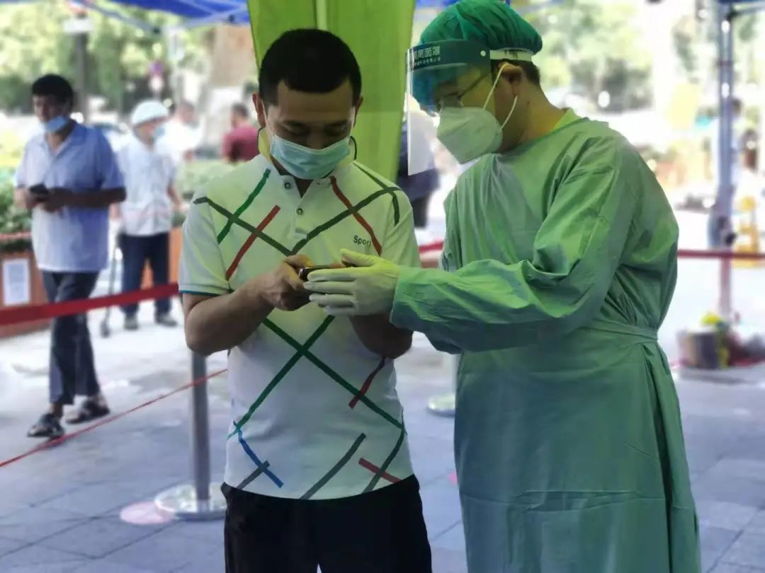 王军在发热门诊做志愿者,指导帮助接受核酸检测者