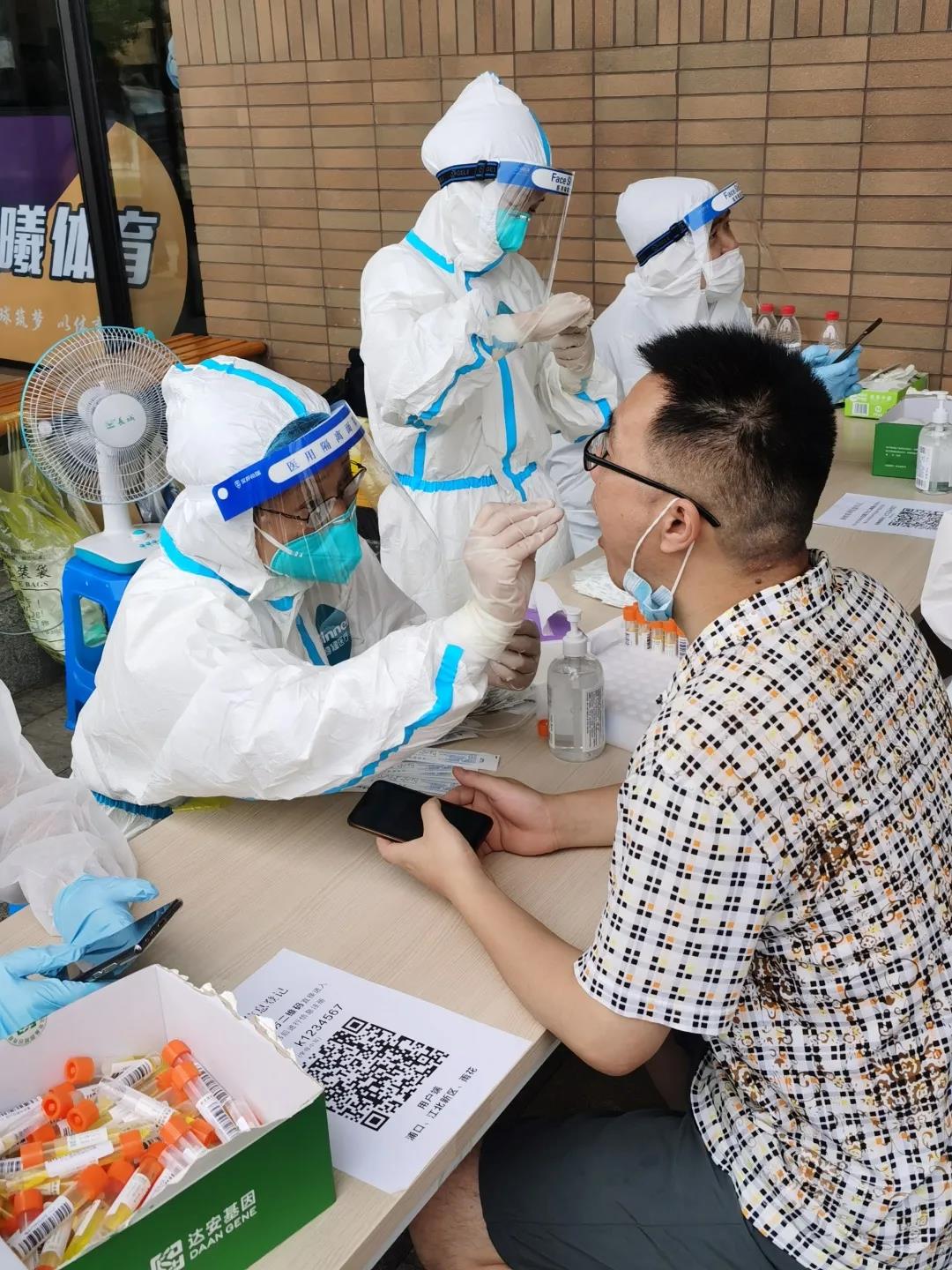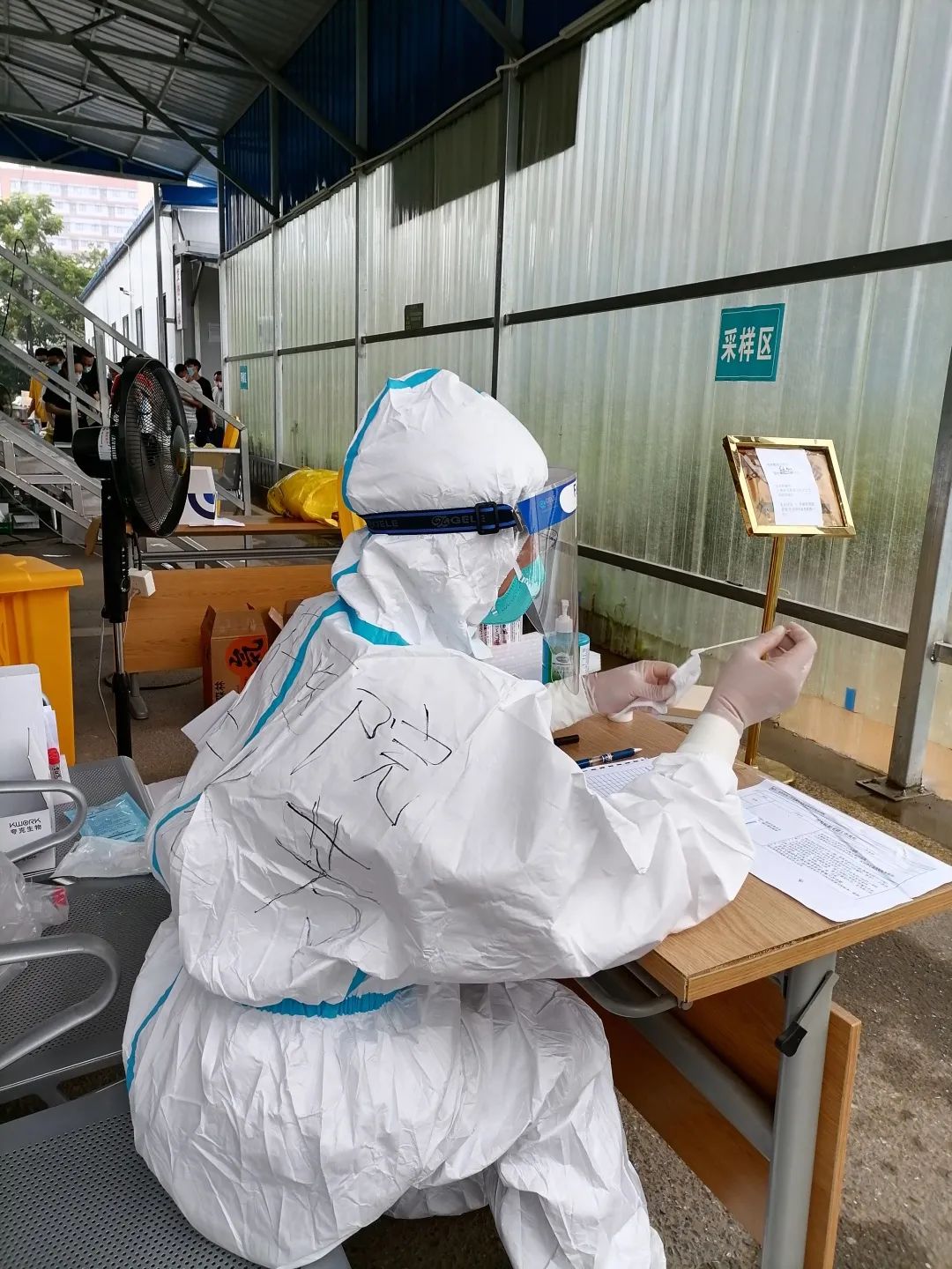7月21日,根据雨花医院安排,朱兆芳赴江宁区援助核酸采样工作。 接下来的十几天,她在一轮轮全民核酸检测、苏康码黄码人员核酸检测和医院本职工作之间来回切换。在雨花台区开展的第一到四轮全民核酸检测及苏康码黄码人员核酸检测中,朱兆芳都留下了自己的身影。朝六晚十、汗如雨下,是她在核酸检测过程中的真实写照。而间歇时间,她还坚守医院内部,站好医院每一班岗,确保每位就诊人员及院内工作人员的健康。 当被问及酷暑天气抗疫是否辛苦时,她说:“我是一名医生,这是我应该做的工作,就当免费做桑拿减肥吧。” 肩上担重负,心中有阳光,朱兆芳抗击疫情一直在身体力行。
