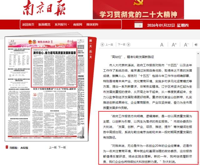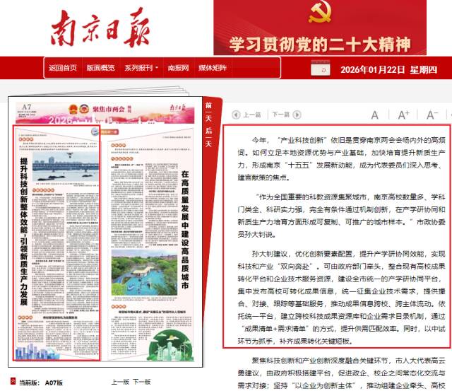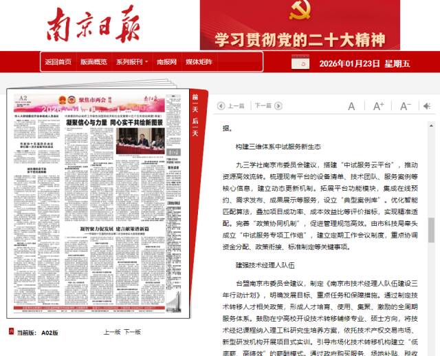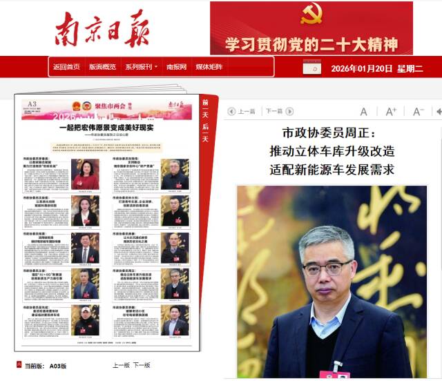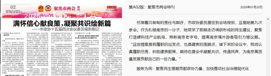 今年市“两会”期间,来自九三学社的人大代表、政协委员们积极参会,围绕南京“十五五”期间经济社会发展大局,深入协商议政,踊跃建言献策,他们的表现受到媒体关注,相关动态获《南京日报》《金陵晚报》等多家媒体报道,展现了九三学社社员强烈的责任担当与昂扬的履职风采。 盛俭、周正、鲍咏梅、孙大钊等在大会报到处接受《金陵晚报》、紫金山新闻采访,分别提出了聚焦打造硬科技产业航母,焕新南京老字号,提高南京境外游客吸引力,推动立体车库升级改造、适配新能源车发展需求,充分发挥中小学法治副校长制度功能,打造青年乐居、企业深耕、创新活跃的南京城等建议。《南京日报》报道了分组讨论期间,孙大钊听取政府工作报告的心得体会,并登载了周正、周慧悦等社员参与讨论的照片。徐月红关于微短剧赋能文商旅体融合发展的建议,孙大钊关于优化创新要素配置、提升产学研协同效能的建议,周慧悦关于打造线上线下融合的宠物平台应用场景的建议,许耀华关于建立“南京曲艺数字基因库”、推动曲艺内容创造性转化的建议,陶玉梅关于南京打造时尚之都城市名片的建议分别获《金陵晚报》《南京日报》和紫牛新闻报道。社市委会关于构建三维体系中试服务新生态的建议作为大会发言内容获得《南京日报》《金陵晚报》报道。社员杨继全在大会闭幕之际关于2026年履职工作的感悟获“南京新闻”视频号报道。 1月20日 怀揣着沉甸甸的责任与期许,市政协委员盛俭到会场报到,这是她第九次参会。作为扎根南京的一分子,她带来了前期走访调研形成的民生建议,聚焦打造硬科技产业航母、焕新南京老字号、提高南京境外游客吸引力等议题。“这些提案是我履职的出发点,也是建言的落脚点,接下来的会议中,我将认真履职尽责,积极建言献策,期待在盛会中凝聚共识、传递民声,为南京高质量发展贡献自己的一份力量。” …… 作为一名两届政协委员,鲍咏梅参会的心情依然很紧张。这次上会,她带来关于“充分发挥中小学法治副校长制度功能”的提案,“八五”普法规划中就强调要加强青少年法治教育,落实法治副校长、法治辅导员制度,2026年是“九五”普法的开局之年,她认为,充分发挥中小学法治副校长制度的功能,推动司法专业力量深度融入学校法治教育,是提升青少年法治教育针对性、实效性的关键举措。“沉甸甸的使命感、责任感让我丝毫不敢松懈,我将时刻关注身边事,深入一线做调研,尽力把基层的声音带上来,为城市发展多尽一份心多出一份力。”鲍咏梅说。 ——《满怀信心献良策,凝聚共识绘新篇——市政协十五届四次会议委员报到侧记》,《金陵晚报》2026年1月20日 市政协委员周正:推动立体车库升级改造,适配新能源车发展需求 今年上会,我的关注点主要是进一步优化完善南京停车资源管理,适配新能源车的发展需求。近年来,南京通过推进停车资源共享、盘活停车资源、加速智慧停车建设等举措,更好地满足了群众停车需求。但城市停车资源管理仍存在一些需要关注的问题,尤其是部分立体车库设计建造标准存在不适应新能源车发展需求的情况。希望通过数字技术赋能优化错时共享、完善数据汇集、稳妥处理欠缴等难题。特别值得关注的是,要进一步完善立体停车库技术标准,明确新建立体车库设计承重标准不低于2.5吨,预留新能源车充电设施安装空间。对设计承重1.5吨或1.8吨、无法满足中型及以上新能源车停放需求的车库,逐步按需分类进行改造。 市政协委员孙大钊:打造青年乐居、企业深耕、创新活跃的南京城 围绕南京高质量发展,今年我重点关注产业国际化能力建设、民营经济发展环境优化、创新要素高效配置以及青年与人口结构的长期支撑等问题,并精心准备提案。这些提案的共同出发点,是通过制度整合和机制优化,把分散的政策资源转化为稳定、可预期的公共服务能力,降低企业和青年在发展中的制度性成本。希望能够通过增强政府与市场的有效衔接、提升创新资源流动效率、完善青年全周期服务和育儿支持体系,推动南京把资源优势转化为长期竞争优势,为城市持续发展夯实基础。城市竞争,归根结底是制度和预期的竞争。希望新的一年南京越来越好,通过大家的努力,让南京成为青年愿意留下、企业愿意扎根、创新持续发生的城市。 ——《一起把宏伟愿景变成美好现实——市政协委员报到之日说心愿》,《南京日报》2026年1月20日 “因为爱马仕、香奈尔、纪梵希,我们感到了巴黎的时尚奔放;因为普拉达、阿玛尼、范思哲,我们感知了米兰的奢华浪漫。” 1月20日,报到参加南京市第17届人民代表大会第五次会议的人大代表陶玉梅带来的建议是:南京亟须打造时尚之都城市名片。 …… 有感于此,陶玉梅代表特提出如下建议: 首先是构建专项政策体系,强化品牌培育支撑。包括设立“服装产业发展奖补资金项目”,重点支持代表企业开展传统文化IP研发、专利申报及国际文化交流,对参与境内外类似国际时尚周的品牌给予30%-50%费用补贴,对开展残疾人技能培训的投入给予重点奖补;将具有鲜明地域文化特色的服装品牌纳入重点培育品牌名录,对其在核心景区开设文化体验店、文化展示馆的,参照首店标准给予奖励;加强南京本土服装知识产权保护,将手工盘扣技艺、特色纹样设计等纳入专项保护目录